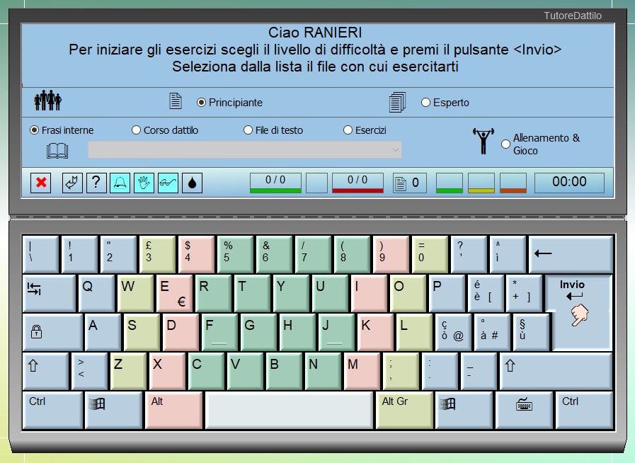 Molto ben strutturato permette varie modalità di apprendimento di questa nobile arte (la dattilografia…!).  Una volta inserito il proprio nome e selezionata la difficoltà generale del programma, dichiarandosi principiante o esperto, è possibile scegliere tra: